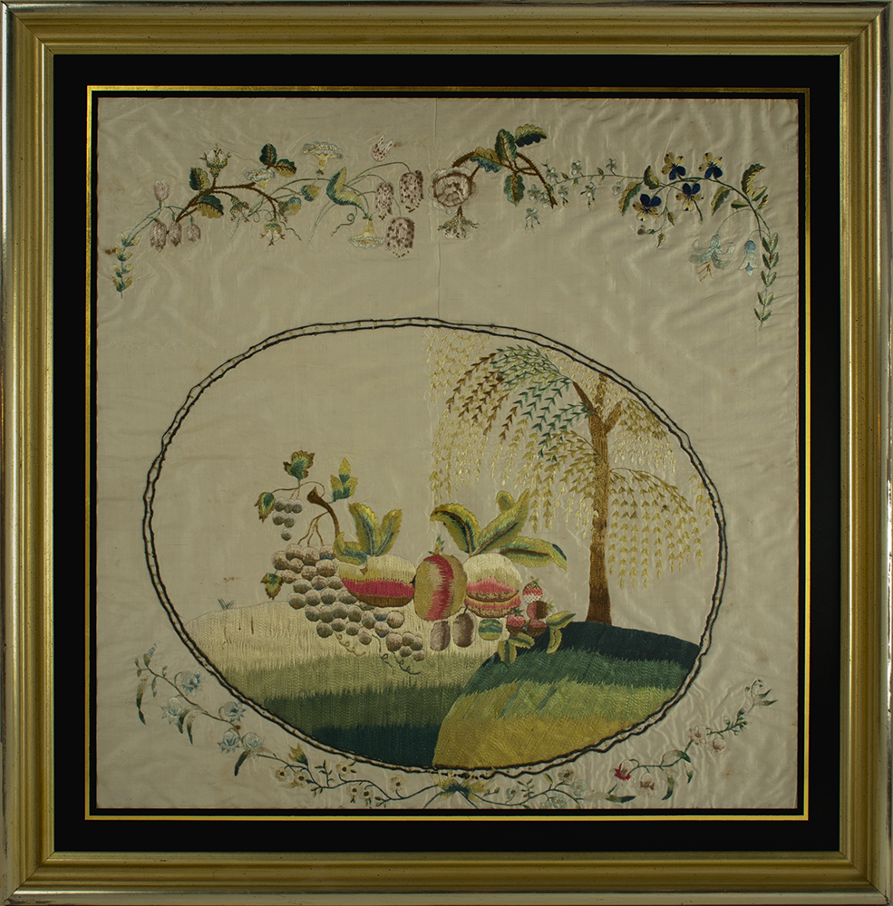 Many samplermakers who continued their education in the needle arts learned to make fine silk embroideries. This excellent example depicts a still life composition of grapes, peaches and strawberries set on hillocks under a graceful willow tree. The shading of the fruit and the grass is particularly adept. A beautifully stitched double oval provides a wonderful enclosure, with flowering branches above and delicate blossoms on vines below.