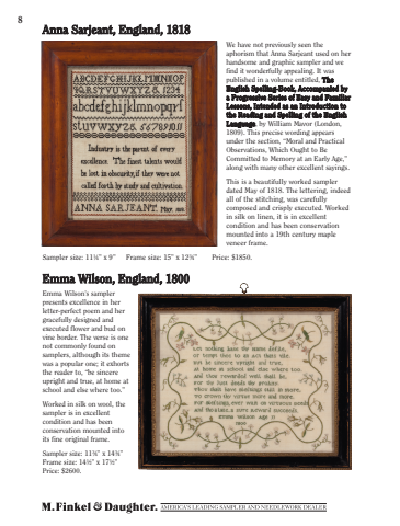 8Anna Sarjeant, England, 1818Emma Wilson, England, 1800We have not previously seen the aphorism that Anna Sarjeant used on her handsome and graphic sampler and we find it wonderfully appealing. It was published in a volume entitled, The English Spelling-Book, Accompanied by a Progressive Series of Easy and Familiar Lessons, Intended as an Introduction to the Reading and Spelling of the English Language, by William Mavor (London, 1809). This precise wording appears under the section, %u201cMoral and Practical Observations, Which Ought to Be Committed to Memory at an Early Age,%u201d along with many other excellent sayings. This is a beautifully worked sampler dated May of 1818. The lettering, indeed all of the stitching, was carefully composed and crisply executed. Worked in silk on linen, it is in excellent condition and has been conservation mounted into a 19th century maple veneer frame. Sampler size: 11%u00bc%u201d x 9%u201d Frame size: 15%u201d x 12%u00be%u201d Price: $1850.Emma Wilson%u2019s sampler presents excellence in her letter-perfect poem and her gracefully designed and executed flower and bud on vine border. The verse is one not commonly found on samplers, although its theme was a popular one; it exhorts the reader to, %u201cbe sincere upright and true, at home at school and else where too.%u201d Worked in silk on wool, the sampler is in excellent condition and has been conservation mounted into its fine original frame.Sampler size: 11%u00be%u201d x 14%u00be%u201d Frame size: 14%u00bd%u201d x 17%u00bd%u201d Price: $2600.