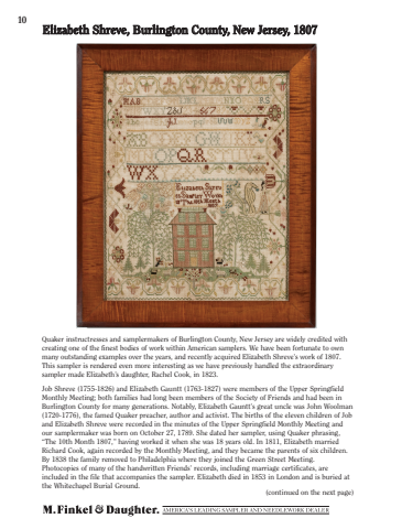 10Elizabeth Shreve, Burlington County, New Jersey, 1807Quaker instructresses and samplermakers of Burlington County, New Jersey are widely credited with creating one of the finest bodies of work within American samplers. We have been fortunate to own many outstanding examples over the years, and recently acquired Elizabeth Shreve%u2019s work of 1807. This sampler is rendered even more interesting as we have previously handled the extraordinary sampler made Elizabeth%u2019s daughter, Rachel Cook, in 1823. Job Shreve (1755-1826) and Elizabeth Gauntt (1763-1827) were members of the Upper Springfield Monthly Meeting; both families had long been members of the Society of Friends and had been in Burlington County for many generations. Notably, Elizabeth Gauntt%u2019s great uncle was John Woolman (1720-1776), the famed Quaker preacher, author and activist. The births of the eleven children of Job and Elizabeth Shreve were recorded in the minutes of the Upper Springfield Monthly Meeting and our samplermaker was born on October 27, 1789. She dated her sampler, using Quaker phrasing, %u201cThe 10th Month 1807,%u201d having worked it when she was 18 years old. In 1811, Elizabeth married Richard Cook, again recorded by the Monthly Meeting, and they became the parents of six children. By 1838 the family removed to Philadelphia where they joined the Green Street Meeting. Photocopies of many of the handwritten Friends%u2019 records, including marriage certificates, are included in the file that accompanies the sampler. Elizabeth died in 1853 in London and is buried at the Whitechapel Burial Ground. (continued on the next page)