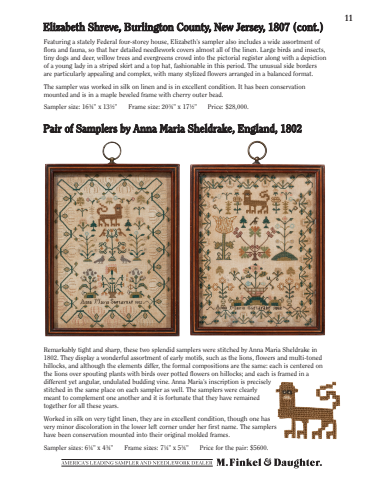 Elizabeth Shreve, Burlington County, New Jersey, 1807 (cont.)11Featuring a stately Federal four-storey house, Elizabeth%u2019s sampler also includes a wide assortment of flora and fauna, so that her detailed needlework covers almost all of the linen. Large birds and insects, tiny dogs and deer, willow trees and evergreens crowd into the pictorial register along with a depiction of a young lady in a striped skirt and a top hat, fashionable in this period. The unusual side borders are particularly appealing and complex, with many stylized flowers arranged in a balanced format.The sampler was worked in silk on linen and is in excellent condition. It has been conservation mounted and is in a maple beveled frame with cherry outer bead.Sampler size: 16%u00be%u201d x 13%u00bd%u201d Frame size: 20%u00be%u201d x 17%u00bd%u201d Price: $28,000.Pair of Samplers by Anna Maria Sheldrake, England, 1802Remarkably tight and sharp, these two splendid samplers were stitched by Anna Maria Sheldrake in 1802. They display a wonderful assortment of early motifs, such as the lions, flowers and multi-toned hillocks, and although the elements differ, the formal compositions are the same: each is centered on the lions over spouting plants with birds over potted flowers on hillocks; and each is framed in a different yet angular, undulated budding vine. Anna Maria%u2019s inscription is precisely stitched in the same place on each sampler as well. The samplers were clearly meant to complement one another and it is fortunate that they have remained together for all these years.Worked in silk on very tight linen, they are in excellent condition, though one has very minor discoloration in the lower left corner under her first name. The samplers have been conservation mounted into their original molded frames.Sampler sizes: 6%u00bc%u201d x 4%u00be%u201d Frame sizes: 7%u00bc%u201d x 5%u00be%u201d Price for the pair: $5600.