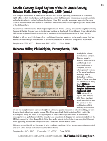 13This sampler was worked in 1850 at this Brixton Hill. It is an appealing combination of extremely tight, letter-perfect stitching and a striking composition that features a prayer and, unusually, isolates and calls attention to variously phrased religious titles. This sampler serves as a legacy to the many talented needleworkers who benefited from their education at the British orphanages and institutions of the 19th century. Research has confirmed some details regarding the maker, Amelia Conway. She was the daughter of Henry James and Matilda Conway, born in London and baptized at Southwark Christ Church. Unsurprisingly, the 1851 census registered Amelia as a scholar in residence at the Royal Asylum of the St. Ann%u2019s Society. Worked in silk on wool, it is in excellent condition with minor weakness to the wool ground that has been stabilized through conservation. It is now mounted and in a molded and painted black frame.Sampler size: 17%u00bd%u201d x 13%u201d Frame size: 19%u00be%u201d x 15%u00bc%u201d Price: $4800.Amelia Conway, Royal Asylum of the St. Ann%u2019s Society, Brixton Hall, Surrey, England, 1850 (cont.)A delightful, almost miniaturized sampler, this was made by Rebecca Miller in 1828 and belongs to an important group of samplers, each of which present versions of the same handsome buildings with a distinctive roof line. Some of these samplers are illustrated in Betty Ring%u2019s Girlhood Embroidery: American Samplers and Pictorial Needlework 1650 - 1850, volume II, as figures 390, 392 and 393. There has been much speculation over the years as to the architecture of this building and whether on not the samplermakers were working from a known, specific mansion or school building, or were drawing inspiration from a print source. Mrs. Ring speculated that the design of this castle-like building was likely the result of a lingering use of early German pattern books. It seems that schoolgirls were quite taken with this structure, as renditions of it appear on samplers made from the 1780s through the 1830s. Large birds, little dogs and a pair of stylized pine trees complete Rebecca%u2019s most appealing needlework composition and a wide line border frames it well. This was worked in silk on linen and it is in excellent condition. It has been conservation mounted and is in a fine period half-column corner-block frame. Sampler size: 8%u00be%u201d x 10%u00bd%u201d Frame size: 12%u201d x 13%u00be%u201d Price: $4300.Rebecca Miller, Philadelphia, Pennsylvania, 1828