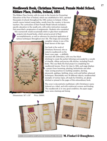 17The Kildare Place Society, with its roots in the Society for Promoting Education of the Poor of Ireland, which was established in 1811, operated thousands of schools throughout the 19th century in Ireland. A three month course trained young ladies, mostly from the country, to become teachers. The curriculum of their Female Model Schools included a specific education in the needle arts, with entire instruction manuals that prescribed a progression of assignments. Students who completed this coursework would occasionally stitch or glue their needlework projects into bound books, which served as proof of their accomplishments, as well as reference for practical application of various techniques throughout one%u2019s life. This large and unusually complete volume is one of the finest known of this type. Our book is the work of Christiana Norwood, who so noted in needlework on the finest cover page %u2013 a skillfully executed silk embroidery, with very fine black stitching to create the perfect lettering surrounded by a wreath of chenille, ribbon and precise silk stitches, including French knots. This was likely the final project in completing her needlework lessons. From 1st class to 16th, each page displays a project from hemming, pleating, buttonholes and other basic sewing practices to marking samplers, darning, piecework, applique, knitting, straw work and further advanced techniques. Remarkably over 54 different objects, needleworked examples of various types, all made by Christina, are glued, stitched or pinned to the pages of this extraordinary book.The cover is decoratively marbleized, with Christiana%u2019s name lettered on a label, and with reinforced corners and binding. The needlework is in very good condition, the paper pages have some staining and foxing.Dimensions: 16%u201d x 10%u201d Price: $6800.Needlework Book, Christiana Norwood, Female Model School, Kildare Place, Dublin, Ireland, 1831