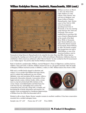 William Rodolphus Storms, Sandwich, Massachusetts, 1826 (cont.)19William was born on March 5, 1817, the third of the eight children of a ship captain, Peter Storms, who was born in Belgium, and Susan Collins of Dennis, Massachusetts. Capt. Storms came to New York in 1802 where he prospered, spending much time in Venezuela, as he was running cargo between New York and Venezuela. This success enabled him to purchase 300 acres of land in Massachusetts at the mouth of the Back River. While in Venezuela, Capt. Storms fathered a son, Simon Pe%u00f1a Storms (named for his friend, Simon Bolivar), in 1830. The family accepted this foreign-born son and in 1840 William, or one of his American brothers, went to Venezuela to bring Simon to Massachusetts to be raised by his sister Mary Ann Ellis. Simon lead an interesting life, heading west with the gold rush in 1849 and settling in Mendocino, California where he established a Native American settlement called %u201cStorms Ranch;%u201d he also worked for the US Government as an %u201cIndian Agent.%u201d He and his older brother William remained close. Back in Sandwich, samplermaker, William, married Margaret A. Pease in Edgartown, and they had two children, Anna and Lizzie, in Boston. William enjoyed success as a dry goods merchant. After the death of Margaret, William married Lucretia A. Robbins, a widow, in 1867. William died in New York in 1882.With such a worldly family steeped in adventure and culture, it is no wonder that William had many talents, and it is evident that needlework was one of them. Alphabets, verse and inscription fill the sampler, within a framework of decorative elements. A procession of fourlegged animals creates a bottom border, while a young man in a top hat actively feeds little chickens in the corner. Classic overstuffed baskets and birds frame the work from the top, and budding vines enclose the composition from each side. Along with a complete and fascinating file of family information and research, the sampler is also accompanied by a handsome daguerreotype of William from the 1850s that descended with it. Worked in silk on linen, Master Storms%u2019 sampler remains in excellent condition. It has been conservation mounted into a molded mahogany frame.Sampler size: 21%u201d x 22%u201d Frame size: 23%u201d x 24%u201d Price: $6800.