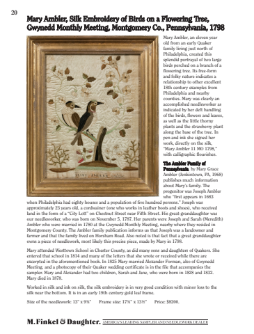 20Mary Ambler, Silk Embroidery of Birds on a Flowering Tree, Gwynedd Monthly Meeting, Montgomery Co., Pennsylvania, 1798Mary Ambler, an eleven year old from an early Quaker family living just north of Philadelphia, created this splendid portrayal of two large birds perched on a branch of a flowering tree. Its free-form and folky nature indicates a relationship to other excellent 18th century examples from Philadelphia and nearby counties. Mary was clearly an accomplished needleworker as indicated by her deft handling of the birds, flowers and leaves, as well as the little thorny plants and the strawberry plant along the base of the tree. In pen and ink she signed her work, directly on the silk, %u201cMary Ambler 11 MO 1798,%u201d with calligraphic flourishes.The Ambler Family of Pennsylvania, by Mary Grace Ambler (Jenkintown, PA, 1968) publishes much information about Mary%u2019s family. The progenitor was Joseph Ambler who %u201cfirst appears in 1683 when Philadelphia had eighty houses and a population of five hundred persons.%u201d Joseph was approximately 23 years old, a cordwainer (one who works in leather boots and shoes), who received land in the form of a %u201cCity Lott%u201d on Chestnut Street near Fifth Street. His great-granddaughter was our needleworker, who was born on November 5, 1787. Her parents were Joseph and Sarah (Meredith) Ambler who were married in 1780 at the Gwynedd Monthly Meeting, nearby where they resided in Montgomery County. The Ambler family publication informs us that Joseph was a landowner and farmer and that the family lived on Horsham Road. Also noted is that fact that a great granddaughter owns a piece of needlework, most likely this precise piece, made by Mary in 1798. Mary attended Westtown School in Chester County, as did many sons and daughters of Quakers. She entered that school in 1814 and many of the letters that she wrote or received while there are excerpted in the aforementioned book. In 1825 Mary married Alexander Forman, also of Gwynedd Meeting, and a photocopy of their Quaker wedding certificate is in the file that accompanies the sampler. Mary and Alexander had two children, Sarah and Jane, who were born in 1828 and 1832. Mary died in 1878.Worked in silk and ink on silk, the silk embroidery is in very good condition with minor loss to the silk near the bottom. It is in an early 19th century gold leaf frame. Size of the needlework: 13%u201d x 9%u00be%u201d Frame size: 17%u00be%u201d x 13%u00bd%u201d Price: $8200.