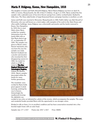 Maria F. Ridgway, Keene, New Hampshire, 181825The daughter of James and Faith (Stowell) Ridgway, Maria Fiducia Ridgway was born on April 19, 1809, in Groton, Massachusetts, the 4th of their 8 children. At age 9, in 1818, Maria worked this fine sampler with a splendid scene of free-form flowers spring from a lattice worked basket, flanked by folky trees. The three-sided border of large-blossomed flowers and grape bunches is excellent, as well. James and Faith were married in Worcester, Massachusetts in 1802. Faith%u2019s father was Abel Stowell of Worcester, who was well known as a clock maker, with examples of his work in the State House and other public buildings. James Ridgway was a silversmith and jeweler and the family removed to Keene, New Hampshire by 1818; this is most likely where Maria worked her sampler. Information from the family bible tells us that Maria died at age 27, on September 27, 1836. The sampler was given to Maria%u2019s sister, Harriet Antoinette who was born the year the sampler was made. Harriet%u2019s husband was a jeweler and inventor who invented the first disappearing cannon in 1862, his model for which is at MIT, as stated in The New England Historical and Genealogical Register, Volume 66 (Boston, 1912). Maria%u2019s sampler descended within the family for many further generations. The moralistic verse worked by Maria holds great appeal; it extols learning, pointing the way to heaven. Interestingly the needlework forming the alphabets was worked in tan color, as indicated by a photo of the reverse, which accompanies the sampler. The scene and wonderful border provided Maria with the opportunity to use stronger colors.Worked in silk on linen, it is in excellent condition and has been conservation mounted into a fine beveled maple frame with an outer bead. Sampler size: 17%u201d x 12%u00be%u201d Frame size: 20%u00be%u201d x 16%u00bd%u201d Price: $4600.