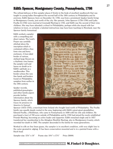 Edith Spencer, Montgomery County, Pennsylvania, 179827The refined delicacy of this sampler places if firmly in the body of excellent needlework that was taught to young ladies throughout the second half of the 18th century in Philadelphia and its environs. Edith Spencer, born on December 16, 1785, was from a prominent Quaker family living in Montgomery County, just north of the city. Her parents, John Spencer (1756-1799) and Lydia Foulke (b.1756) were married at Gwynedd Meeting in 1783, and Edith was the second of their nine children. She may have attended a school in Philadelphia, perhaps while she stayed with her relatives in town, or certainly a talented instructress may have been teaching in Moreland, near the Spencer family homestead. Edith worked a sampler with a compelling and direct nature. The Lord%u2019s Prayer was carefully stitched above the inscription which is contained within a freeform vine and berry enclosure. A four-sided border of various, stylized large flowers on a rhythmic vine frames the sampler well and leaves no doubt as to Edith%u2019s aptitude as a needleworker. This border echoes the very fine bands and borders found on Philadelphia samplers from earlier in the 18th century.Quaker records, published genealogies and other family papers provide further information about the Spencer family, which traces its presence in America to Samuel Spencer (1672-1705), a merchant from Ireland who bought land north of Philadelphia. The Foulke family was equally deeply rooted in the area, beginning with Edith%u2019s great-great grandfather, Edward Foulke, a Welshman, who came to Pennsylvania in 1698 with his wife and children. He purchased a tract of 700 acres outside of Philadelphia and by 1700 had joined the newly established Friends Meeting, becoming an active leader and supporter. Edith remained single and in 1857 transferred her membership to the Abington Monthly Meeting, also in Montgomery County, which recorded her death in 1865. The sampler descended in the family for many generations. Worked in silk on fine linen gauze, the sampler is in excellent condition, with very slight loss to the outer geometric edging. It has been conservation mounted and is in a painted frame with a black bead. Sampler size: 15%u00be%u201d x 14%u201d Frame size: 19%u00bd%u201d x 17%u00be%u201d Price: $8000.