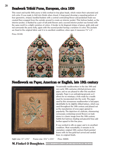 28Beadwork Trifold Purse, European, circa 1830Needlework on Paper, American or English, late 18th century This sweet and tactile little purse is fully worked in tiny glass beads, which retain their saturated and rich color. It was made to fold into thirds when closed. A long panel showing a repeating pattern of four geometric, striped, handled baskets with a central contrasting flower and pendulant buds was created then wrapped from the outside around to create an interior pocket. This bottom basket, as the interior pocket, is flanked by a pair of tall pink flowers and a second interior pocket was formed with the same motif in a slight variation of colors. A border in fat diagonal stripes of green, gold, pink and red surrounds the purse fully, again with the second pocket having a variation in color. The pockets are lined in the original fabric and it is in excellent condition; when open it measures 7%u00bc%u201d x 4%u201d.Price: $1100.Occasionally needleworkers in the late 18th and very early 19th centuries stitched pictures onto paper, and we are pleased to offer this excellent example. Paper is an unforgiving ground, as it allows for no missteps; a hole made by a needle must be incorporated into the work. The paper used by this anonymous needleworker is laid paper, identifiable by its slightly ribbed texture, which was used throughout the 18th century and phased out as the manufactory of wove paper gained in popularity. The depiction of a delicate, shimmering cornucopia containing several flowers on leafy stems is a classic image from the 18th century. Subtle but lustrous shading and graceful lines add further appeal to this fine piece.It was worked in silk on paper and is in excellent condition. Most remarkably, it remains in its exemplary original 18th century black painted frame with its fine gold-leaf carved and sanded liner, in original finish.Sight size: 11%u201d x 9%u00bc%u201d Frame size: 15%u00bc%u201d x 13%u00be%u201d Price: $2600.