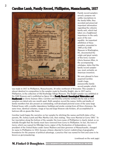 Caroline Lamb, Family Record, Phillipston, Massachusetts, 18172Family record samplers served a purpose not unlike inscriptions in the family bible; they recorded and preserved important information regarding the cohesive family unit, which had taken on a heightened importance in the early years of the new republic. An important exhibition of these samplers, presented in 1989 at the DAR Museum in Washington, DC, documented the origin and great variety of this form. Curator Gloria Seaman Allen, in the accompanying catalogue, states that the family record sampler was, most certainly, an American invention.We were pleased to have acquired Caroline Lamb%u2019s large, praiseworthy family record sampler which was made in 1817 in Phillipston, Massachusetts, 30 miles northwest of Worcester. This sampler is almost identical in composition to the sampler made by Dorothy Knight, also in 1817 and in Phillipston, in the collection of Old Sturbridge Village Museum. The Knight sampler was exhibited at the DAR Museum and is published as figure 64 in Family Record: Genealogical Watercolors and Needlework by Gloria Seaman Allen. Caroline and Dorothy certainly worked side-by-side as their samplers are dated only one month apart. Both samplers record the names, births and deaths of family members but also present an outstanding, well-developed pictorial scene of the same large Federal house with a smaller dependency building and smoke coming from all three chimneys, the same trees, identical columns, swags at top and large blossom side borders, all accomplished in lustrous silk on gauze-like linen. Caroline Lamb began the narrative on her sampler by stitching the names and birth dates of her parents, Mr. Joshua Lamb and Miss Martha Cole, then stating, %u201cthey were Married at Gerry 1803.%u201d In her inscription along the bottom of the sampler the town name of Phillipston is clearly stated, so we initially thought that the family must have removed from Gerry to Phillipston. In fact, the town of Gerry, which was named for Elbridge Gerry, signer of the Declaration of Independence, vicepresident of the United States under James Madison and later governor of Massachusetts, changed its name to Phillipston in 1812, because citizens objected to Gerry%u2019s redistricting of geographic boundaries for the purpose of political advantage, a practice that was named for him and came to be known as gerrymandering. (continued on the next page)