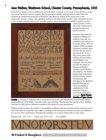 Jane Walton, Westtown School, Chester County, Pennsylvania, 18154Collectors of Quaker school needlework will find much to admire in the work of Jane Walton, a newly discovered Westtown School sampler. This large and beautifully stitched sampler epitomizes the aesthetic of needlework produced at Westtown (aka Weston) School in the early years of the nineteenth century. A large scale alphabet, worked in the block-letter Quaker style, dominates the top of the sampler and the bottom of it includes quarter and half geometric medallions which are also classic Quaker motifs. All of the needlework is formed of extremely precise stitches.Jane was older than the majority of Westtown%u2019s students when she was admitted to the school on 8 month, 12 day, 1815, as student #1388, according Westtown archivist, Mary Brooks. Her account at the school was in her own name and records indicate that her father, Daniel Walton, was deceased. Jane was born in 1789, the oldest of Daniel and Martha (Foulke Green) Walton%u2019s five children. The Walton family lived in Richland, northern Bucks County, Pennsylvania and belonged to the Richland Monthly Meeting, an early meetinghouse established in 1742. Extensive Friends%u2019 records and published accounts (Early Friends Families of Upper Bucks County by Clarence V. Roberts) tell us much about this family and indicate that Jane married widower Samuel Roberts (1782-1856), a member of the same Meeting. They became the parents of four children. Jane died in 1865 and her sampler remained in the family for many generations. Worked in silk on linen, the sampler is in excellent condition with the exception of the small area at the top of the letter K, along the upper edge. According to the family, the unframed sampler was nibbled at by a mouse. Now conservation mounted, the sampler is in a cherry frame with an outer bead.Sampler size: 18%u00bd%u201d x 14%u201d Frame size: 22%u00bd%u201d x 18%u201d Price: $6800.
