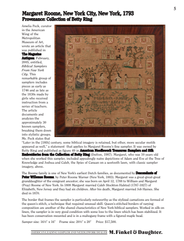 5Margaret Roome, New York City, New York, 1793Provenance: Collection of Betty RingAmelia Peck, curator in the American Wing of the Metropolitan Museum of Art, wrote an article that was published in The Magazine Antiques, February, 2005, entitled, Biblical Samplers From New York City. This remarkable group of samplers includes pieces as early as 1746 and as late as the 1830s made by girls who received instruction from a series of teachers. The article documents and analyzes the approximately 30 known samplers, breaking them down into stylistic groups. Ms. Peck states that %u201cLater in the [18th] century, some biblical imagery is retained, but other, more secular motifs appeared as well,%u201d a statement that applies to Margaret Roome%u2019s fine sampler. It was owned by Betty Ring and published as figure 49 in American Needlework Treasures: Samplers and Silk Embroideries from the Collection of Betty Ring (Dutton, 1987). Margaret, who was 10 years old when she worked this sampler, included appealingly na%u00efve depictions of Adam and Eve at the Tree of Knowledge and Joshua and Caleb, the Spies of Canaan on a sawtooth lawn, with classic sampler imagery, above. The Roome family is one of New York%u2019s earliest Dutch families, as documented by Descendants of Peter Willemse Roome, by Peter Roome Warner (New York, 1883). Margaret was a great-great-great granddaughter of the emigrant ancestor; she was born on April 12, 1788 to William and Margaret (Pray) Roome of New York. In 1808 Margaret married Caleb Stockton Halsted (1787-1827) of Elizabeth, New Jersey and they had six children. After his death, Margaret married Job Haines. She died in 1870.The border that frames the sampler is particularly noteworthy as the stylized carnations are formed of the queen%u2019s-stitch, a technique that required unusual skill. Queen%u2019s-stitched borders of varying composition are another of the shared characteristics of New York biblical samplers. Worked in silk on linen, the sampler is in very good condition with some loss to the linen which has been stabilized. It has been conservation mounted and is in a mahogany frame with a figured maple bead. Samper size: 16%u00bd%u201d x 16%u201d Frame size: 20%u00bd%u201d x 20%u201d Price: $17,500.