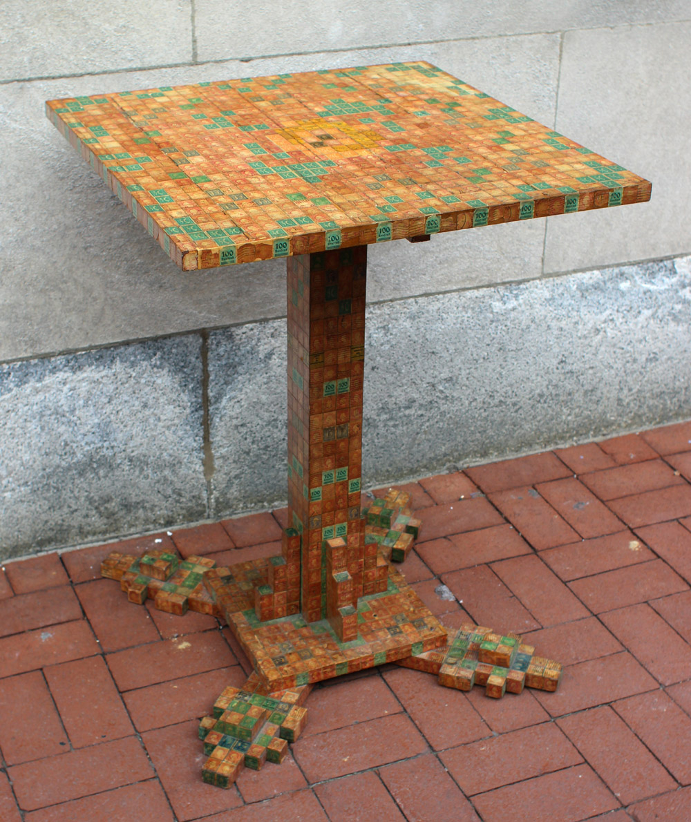 Center table fully decorated with cancelled stamps. The design of the table was such that the dimensions of every part of it are determined by the height and width of a postage stamp and every inch was covered by full stamps. American, probably Mid-West States, and some dates found on the stamps are 1931 and 1933. The architecture is that of period skyscrapers.