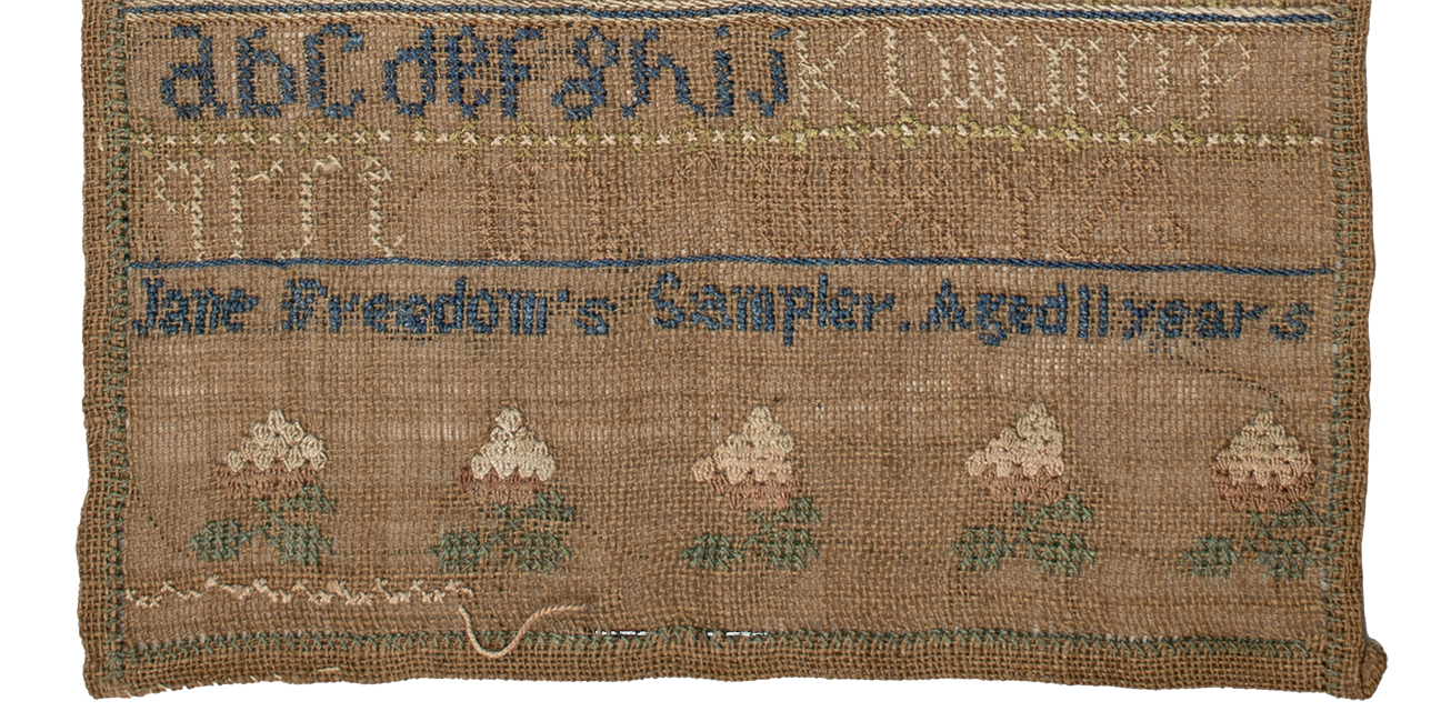 Wilmington, the largest city in the state, is located in New Castle County and Philadelphia is just over thirty miles to the northeast. Girls in New Castle County had easier access to schools and materials needed for samplers than those in the two more rural counties. New Castle girls many different styles of samplers, including many complex designs. They stitched samplers instructed or influenced by Quaker teachers. A style of samplers featuring compartments for verses or initials, ornate floral designs in baskets, and intricate floral borders persisted in New Castle County from the late 1700s through the 1830s. Some made alphabet samplers or variations on them.
