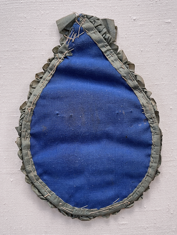 The back fabric is a beautiful bright blue and we took a photo of it prior to conservation mounting. This is in excellent condition and has been conservation mounted into a shadowbox frame.