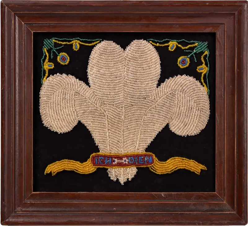 Tiny, shimmering glass beads stitched to black wool form this heraldic badge of the Prince of Wales. The badge consists of three white ostrich feathers held by a ribbon that bears the German motto, "ICH DIEN," which translates to "I serve.”