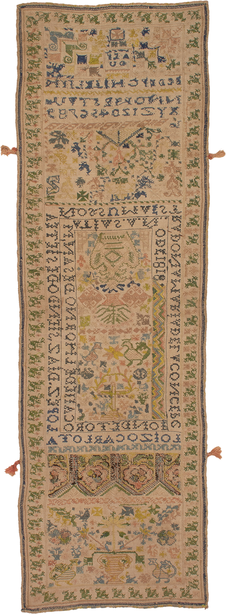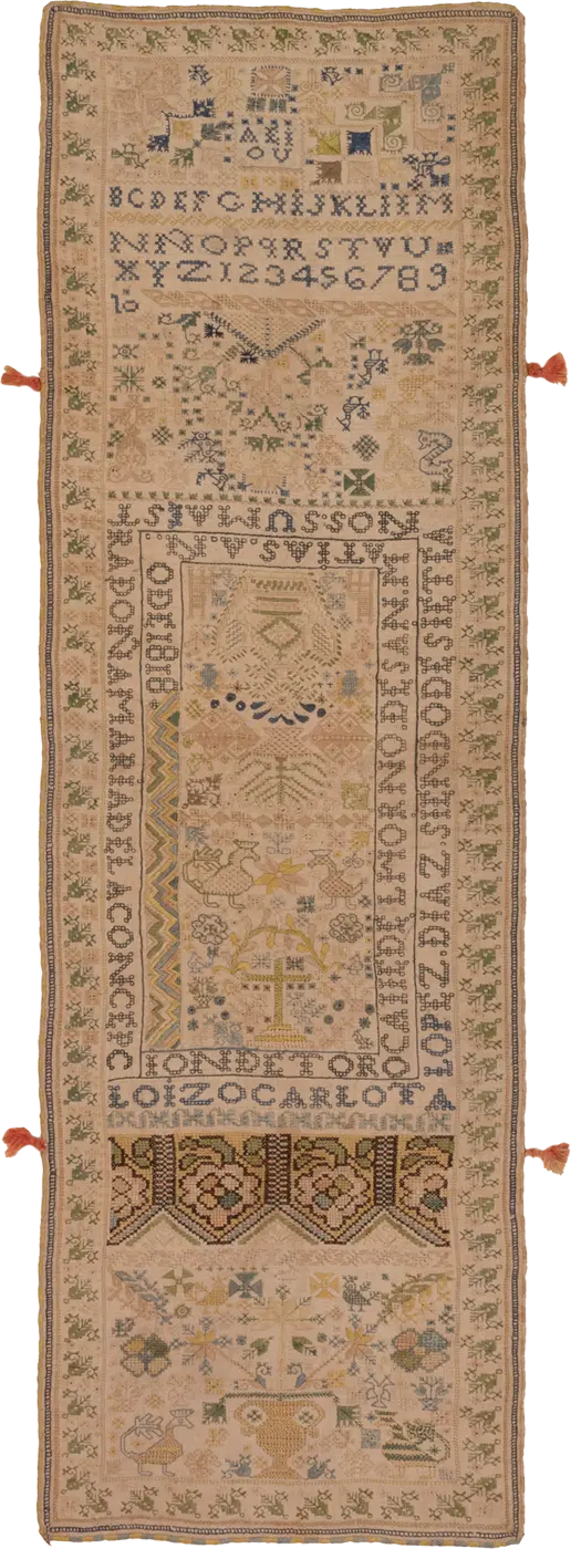 Excellent sampler made by Carlota López Diaz in 1818 under the instruction of Doña María de la Concepción de Toro in Granada, Spain. Original tassels. This sampler, along with 11 others, is discussed in a recent essay, Samplers from Spain: An Introduction by Dr. Lynne Anderson, Founder and Director of the Sampler Consortium and Director of the Sampler Archive Project, which can be read here.