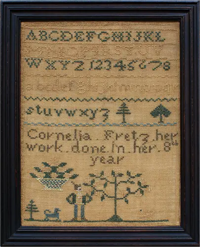 A delightful little sampler, this was made by Cornelia Fretz when she was 7 years old (“in her 8th year”) and living in Solebury, Bucks County, Pennsylvania. It was likely one of her first needlework projects; it begins with alphabets and finishes with an endearing pictorial scene and her inscription.