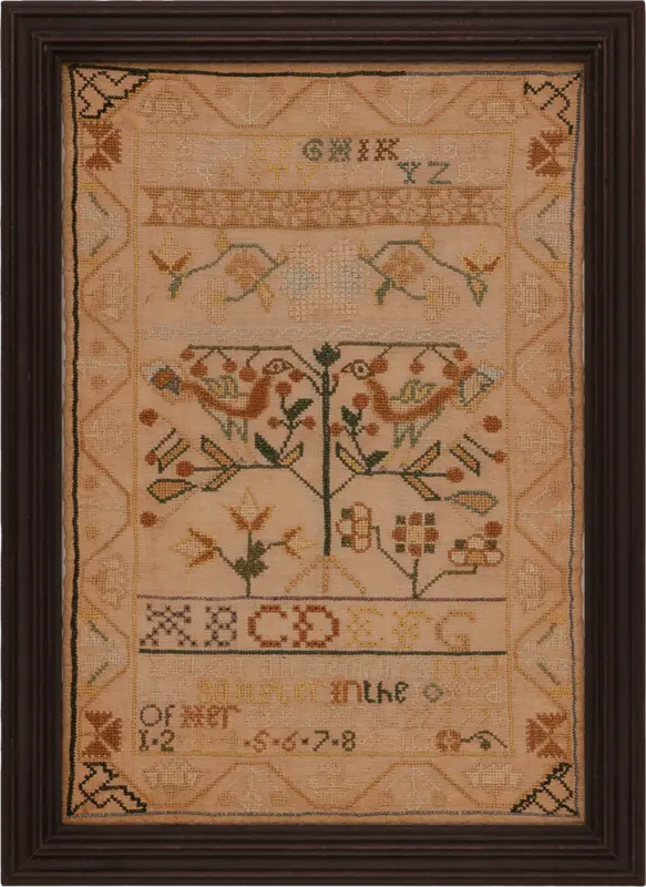 The sampler was worked in silk on linen and is in excellent condition. It has been conservation mounted and is in a molded and black painted frame.