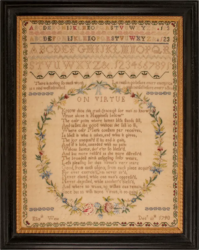 A classic and beautifully made sampler, this features a lengthy poem written by Alexander Pope, “On Virtue,” [see below]. This is contained within an outstanding oval enclosure of lustrous, delicate flowers on a leafy vine, with a blue silk bowknot at the top.