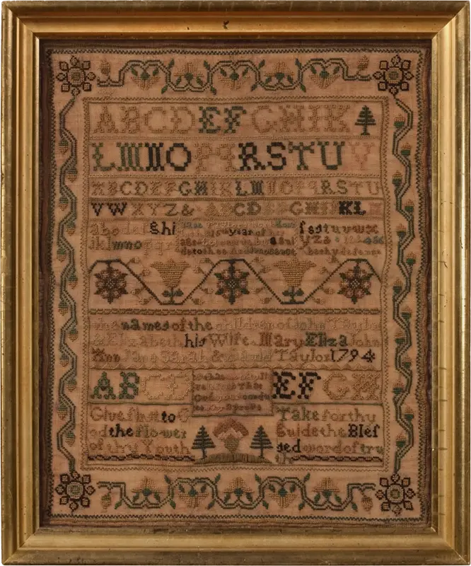 The 18th century samplers made in Chester County, Pennsylvania have been the subject of study by scholars and curators since the 1960s. They feature strong regional characteristics, sophisticated design and expert needlework. Influences on this needlework include the samplermaking traditions from Philadelphia, specifically the bands and compartments, tiny pine trees, queen’s-stitched motifs and listings of family names, all worked in very fine silk stitches onto gauze-like linen. We are delighted to offer this praiseworthy and significant sampler, an excellent example of this group.
