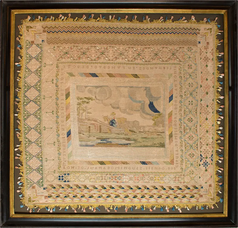 Large and Important sampler made by 12-year-old Juana Dominguez in 1743 while a student of Doña Antonia Fernandez.