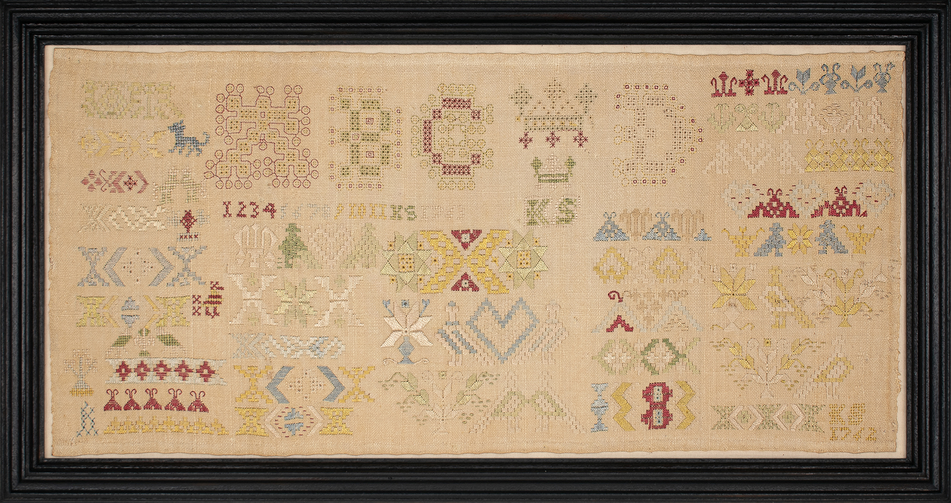 Friesian samplermakers rarely signed their work with their names, using instead their initials. In this case, the initials, K.S., appear under a crown and after the little numerals of the date, 1763. This sampler features many motifs and patterns that would have been embroidered onto household textiles and clothing for both men and women. Included as well are little birds, animals, stars and hearts.
