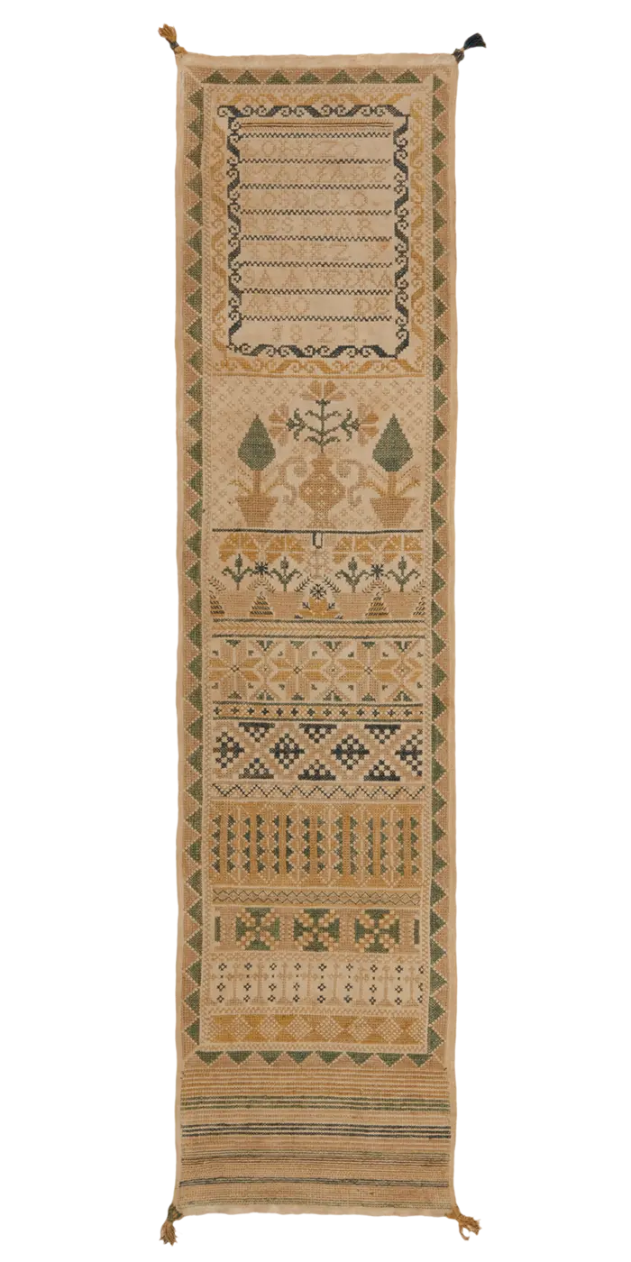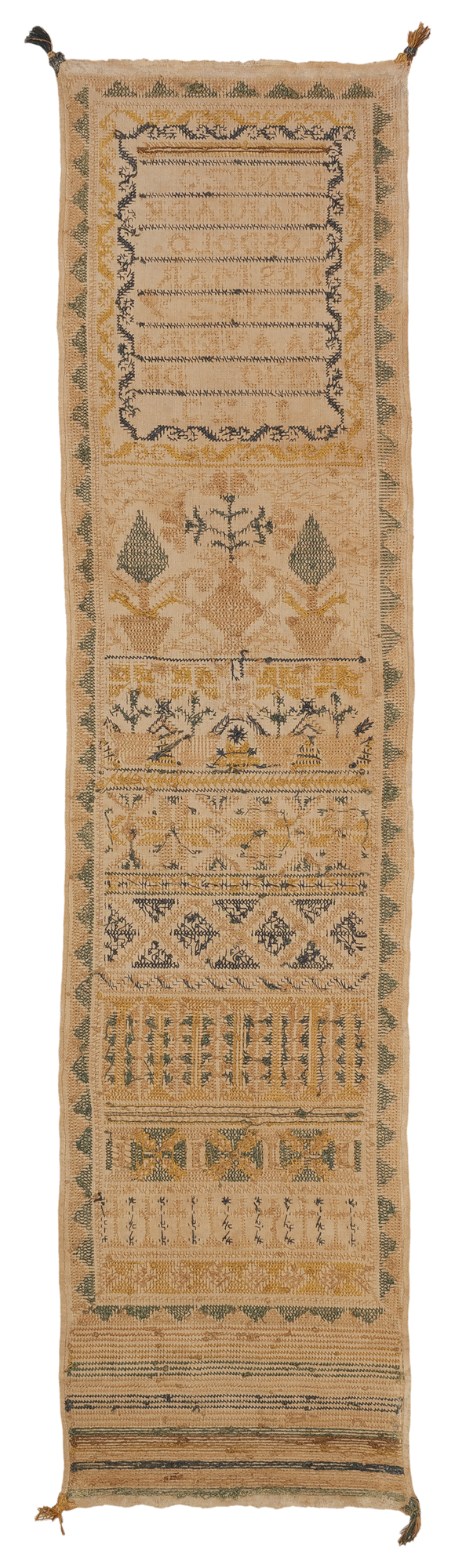 Fine sampler made by Maria de los Dolores Martinez in 1823, featuring many motifs and decorative bands and with its original tassels. This sampler, along with 11 others, is discussed in a recent essay, Samplers from Spain: An Introduction by Dr. Lynne Anderson, Founder and Director of the Sampler Consortium and Director of the Sampler Archive Project, which can be read here.