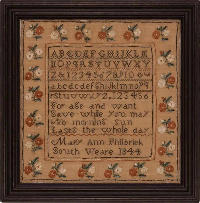 A fine little sampler, this was made by Mary Ann Philbrick who lived in South Weare, New Hampshire. Mary Ann stitched a couplet that was penned by Benjamin Franklin and published in Poor Richard’s Almanac, “For age and want save while you may / No morning sun lasts the whole day.” The border was formed with 22 delightful sprigs of flowers that serve as an excellent framework for the alphabets, numerical progressions, Franklin quotation and inscription.