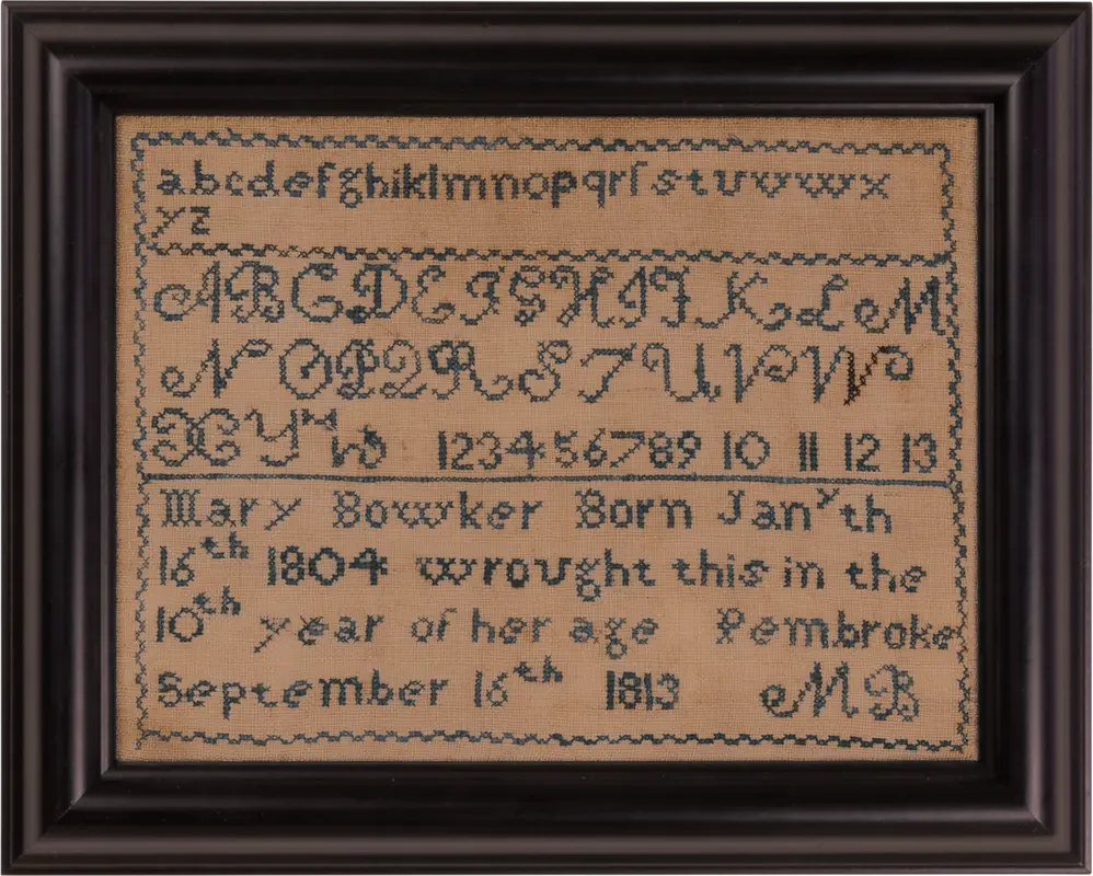 A charming little sampler, this was made by Mary Bowker who was age 9 (“in the 10th year of her age”) and living in Pembroke, a small town located about 13 miles north and a little west of Plymouth. Her neatly stitched inscription provides the specifics about her birth date, her age and her town, ending with her initials worked in the scripted alphabet that she practiced in the uppercase alphabet above.