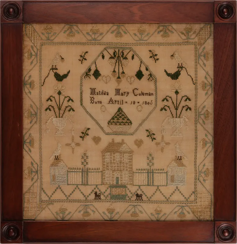 This is a very handsome and particularly interesting sampler. It exhibits characteristics of other Philadelphia area samplers but was also a bit of a mystery. A brick house is centered within fences and small pale blue cottages with large birds perched on top. The date, 1829, is stitched just below the front door in a little rectangle in between two black dogs. The large octagonal surround contains the name of the maker and her birth date informing all that the samplermaker was 24 years old. After quite a bit of genealogical research, we feel certain that we have figured out the identity of Matilda Mary Coleman and are delighted to reunite the sampler with this information.