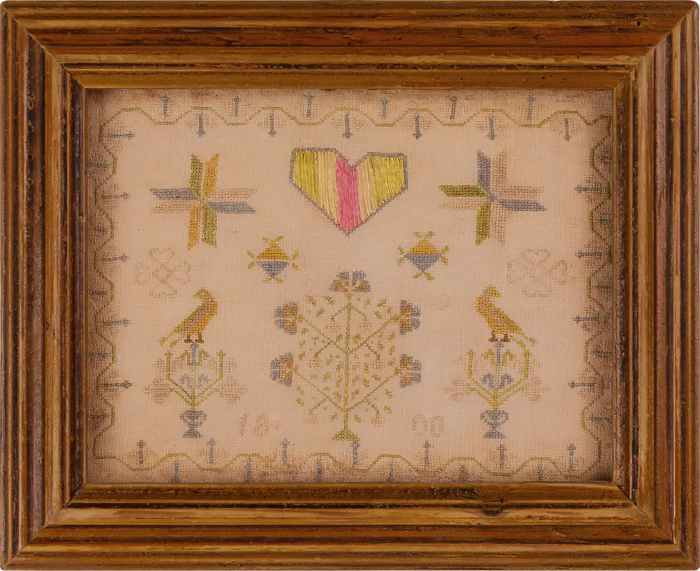 The needlework is extremely fine and was accomplished onto a tightly woven linen ground. A classic English composition, this displays symmetrical motifs including hearts, crosses, birds perched on potted plants and a central flowering tree. The large heart was filled in with long satin stitches in green, yellow and pink. A decorative, undulating border finishes the piece nicely.