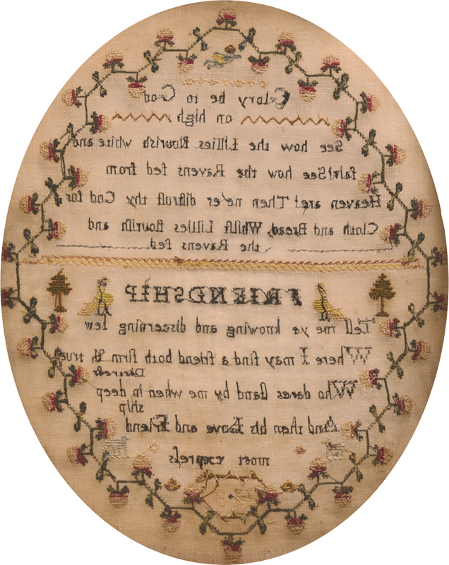 We very occasionally find samplers worked in an oval format and these are wonderful treasures. The composition is always highly refined and reflects the oval structure, and we generally find the needlework to be very delicate. Adding to the many attributes of this particular oval sampler is the fact that it remains in its very fine, original inlay frame.