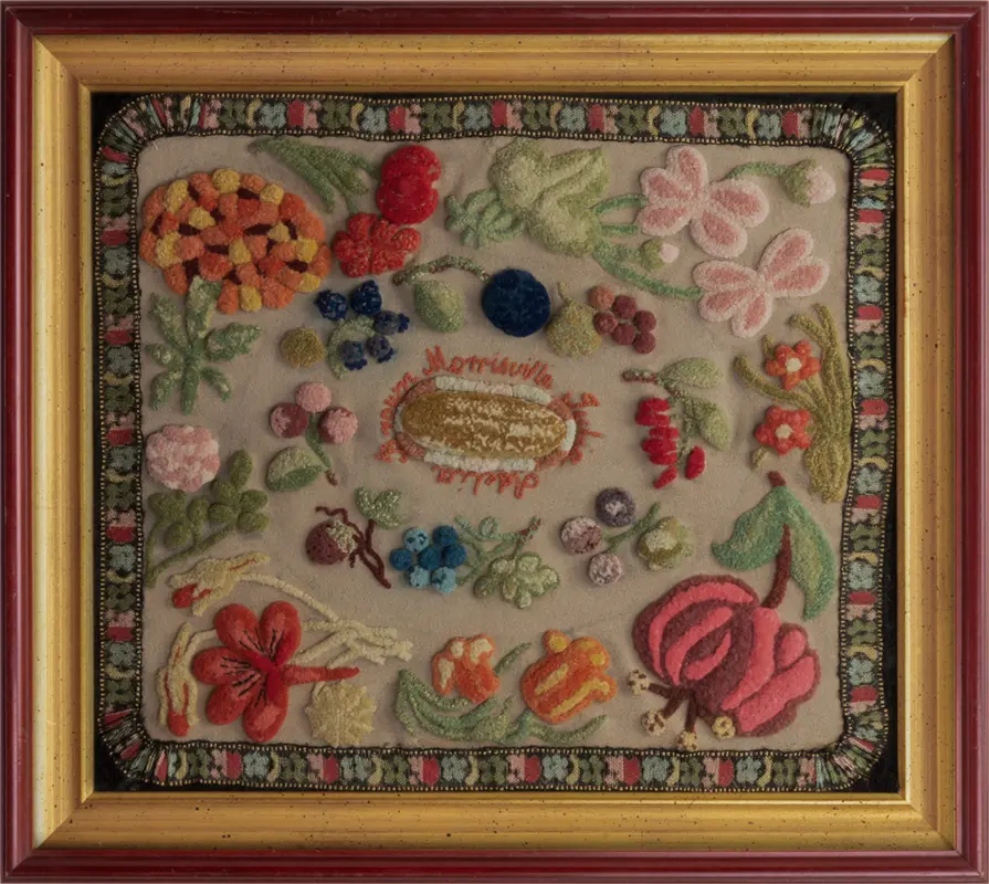 This technique became popular in the middle of the 19th century. When skillfully worked, the result can be outstanding, and we are pleased to offer one of the most aesthetically pleasing examples that we have owned in many years. The great majority of these are unsigned, rendering this one even more desirable as the maker signed it, “Julia Adelia Brown” and added the name of her town, Morrisville.