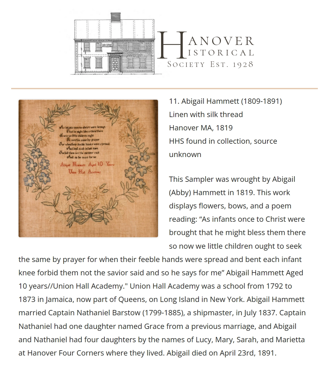 These samplers led us to research the school and an article, “Old Union Hall and Early Education in Jamaica”, published in Long Island Life, May and June 1917, provides much information. The school opened its doors on May 1, 1792, at that time admitting only boys. After some years and once the school was well established, the following notice appeared: