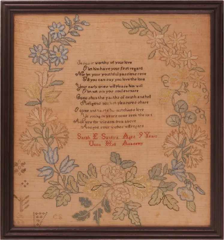 Sarah E. Sanford, age 9 and a student at Union Hall Academy in Jamaica, New York, worked this fine sampler with a religious poem centered within a very stylish flower wreath. The sampler brought this school, which was previously unknown to us, to our attention, and we became aware of another sampler made there. Now in the collection of the Hanover Historical Society in Plymouth County, Massachusetts, this was made by Abigail Hammett circa 1819.