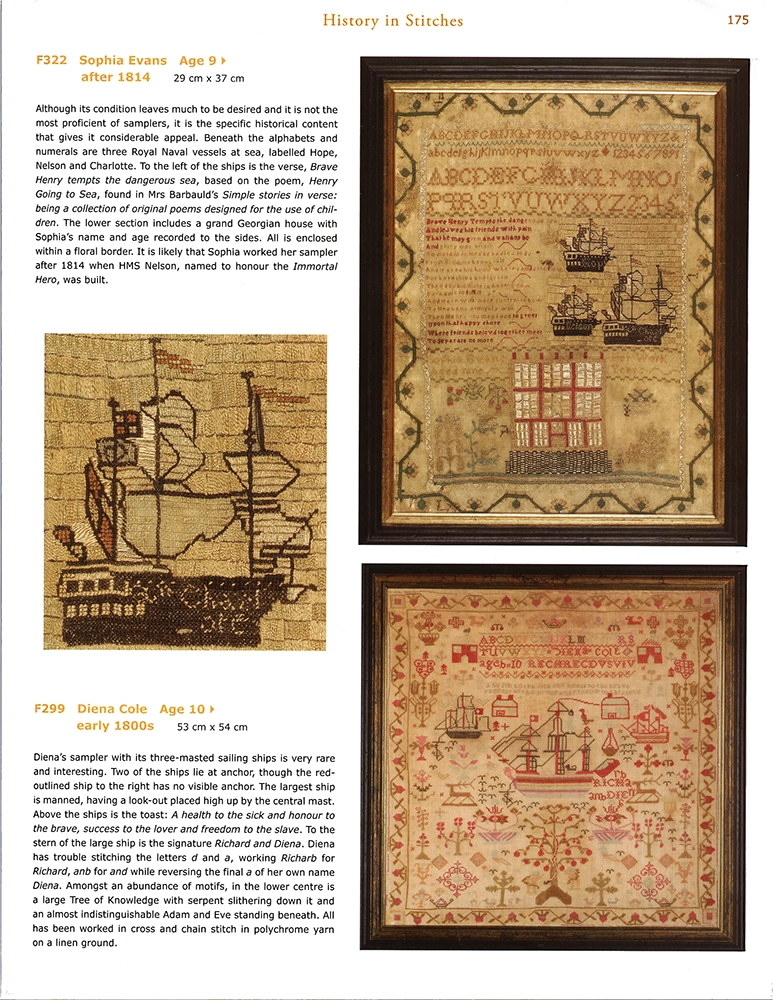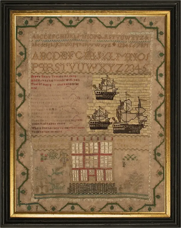 A very interesting sampler, this is signed, “Sophia Evans, Aged nine.” The highly unusual, solidly stitched scene of three Royal Navy warships in full sail dominates the sampler; the ships are the Hope, Nelson and Charlote [sic]. The Hope was sold in 1819; the Nelson was built in 1814 and the Charlotte was a schooner that was wrecked in 1801. This type of subject matter appears only rarely on samplers. The verse, transcribed below, is also in regard to ships at sea. It was based on a publication by Anna Laetitia Barbauld (1743-1825), a prominent English poet, essayist and reformer, considered a woman of letters, when, of course, there were very few.