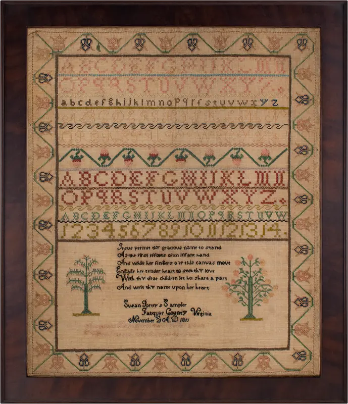A very fine and large sampler, this is signed, "Susan Porter's Sampler / Fauquier County Virginia / November 21st AD 1811.” Susan Porter was the daughter of Samuel Porter, Jr (1780-1836) and Mary Bird (Withers) Porter (1776-1831) of Warrenton, Fauquier County, Virginia. The Porter family roots in Virginia extend back to Susan’s 4x great-grandfather, Jacob Porter who was born in England and died in Virginia. Susan’s year of birth was likely 1803, which would have made her very young when she made this sampler. We know that she married in 1819, when she was likely 16 and that marriage on February 22 is recorded in Virginia Compiled Marriages 1740-1850. Her husband was Samuel Blackwell (1791-1853) and the first of their eight children was born the year they married. By 1850, Susan and Samuel removed to Illinois, settling in Hillsboro, Montgomery County. They both died there in 1853.