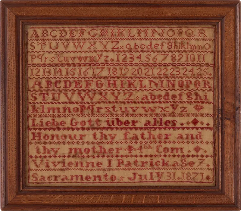 William and Clara must have enrolled Vivienne in school soon after they arrived there, as her sampler is signed, “Vivienne I Patrick, age 7, Sacramento, July 3, 1871.” Above that, she stitched, “Honour thy father and thy mother 4th Com,” and the line above that reads, in German, “Liebe Gott uber alles” – “Love God above all else.”